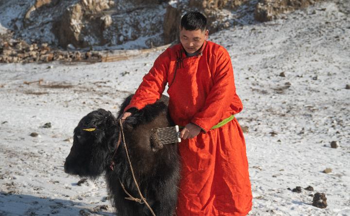 It is in these snow-covered winter landscapes of the Okhon Valley that our supply chain begins. With nomads like Muugii and his family, who spend the winter in the lee of the mountain landscape with their herd of yaks. Beneath their feet, the frozen Orkhon River meanders through the valley, lined with dense forests, rolling hills and pastures that glow green in summer. Small yurts can be seen here and there, harmoniously blending into the natural surroundings. Muugii's parents live in one such yurt, built of wood and thick fur and heated by coal and dried manure. They live on milk, meat and the wool of their animals.